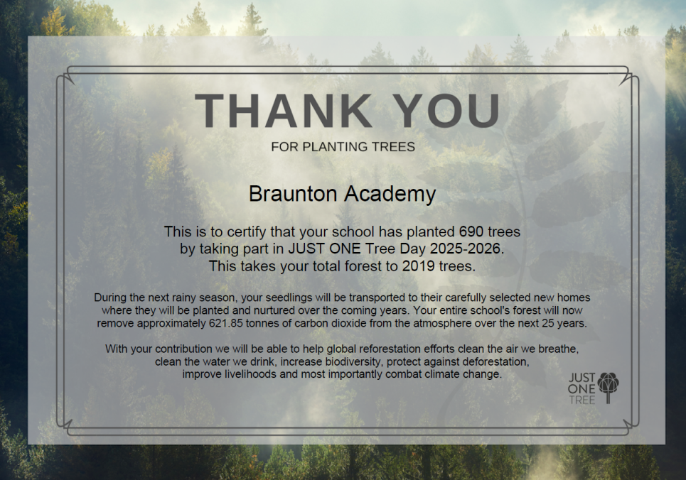 Braunton Academy really cares about the environment. So, we were excited to support JUST ONE Tree to combat climate change and protect the future by having a non-uniform day on Friday 24th October 2025.