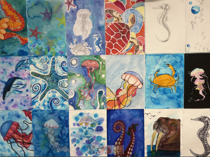 Year 9 students have been studying ‘Sea Creatures’ and have looked at the work of Californian artist Tamara Murphy. They were given the opportunity to self select from a variety of art materials such as inks, pen, coloured pencils and paints to create their own A3 work.