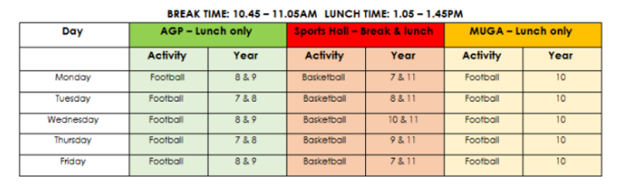 Students playing Football on the AGP at lunchtimes must wear their shin pads with trainers or football boots. They do not need to wear PE kit.
